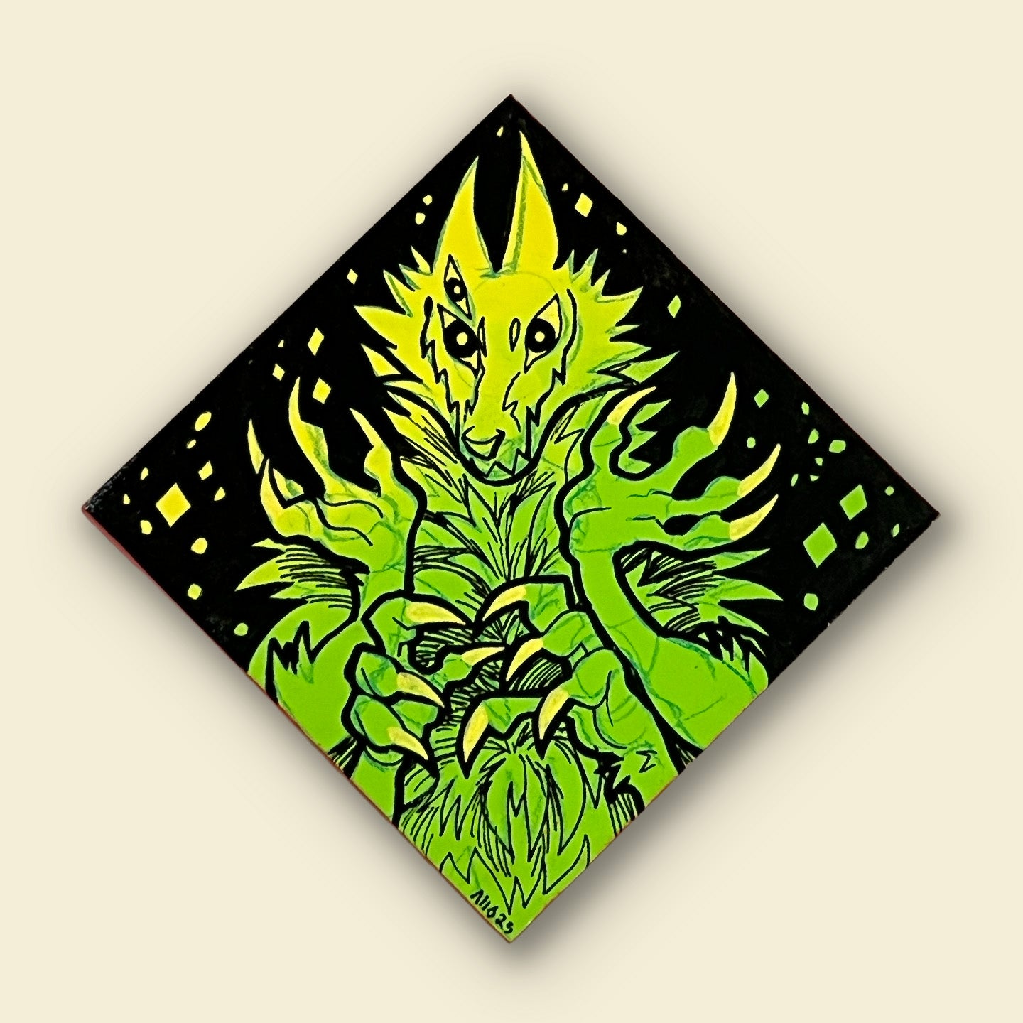 UV reactive acrylic on wood. Measures approx 12 x 12 cm (4 x 4 in).